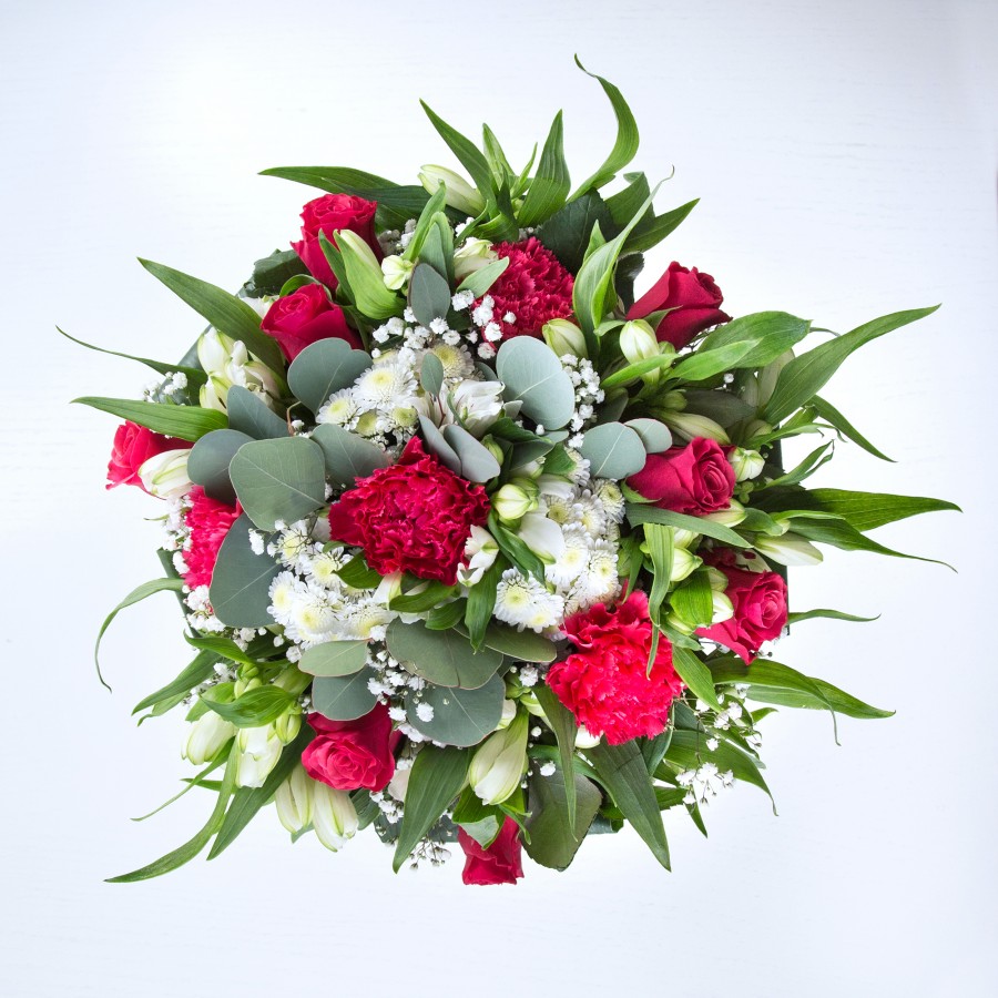 The exquisite combination of fresh blooms truly lifted my spirits. Every element, from the vibrant reds to the delicate whites, was perfectly balanced.